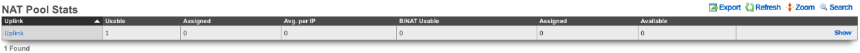 The BiNAT Pool Stats table lists the current state of any configured BiNAT pools. Uplink lists the uplink the IP addresses of the BiNAT pool belong to. Pool displays the name of the BiNAT pool. Usable lists the number of usable IP addresses in the pool. Assigned displays the number of addresses that have been assigned in the pool. Available displays the remaining number of IP's that are available to be assigned for BiNAT.