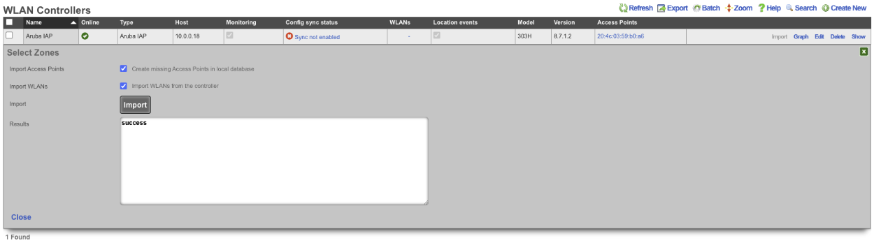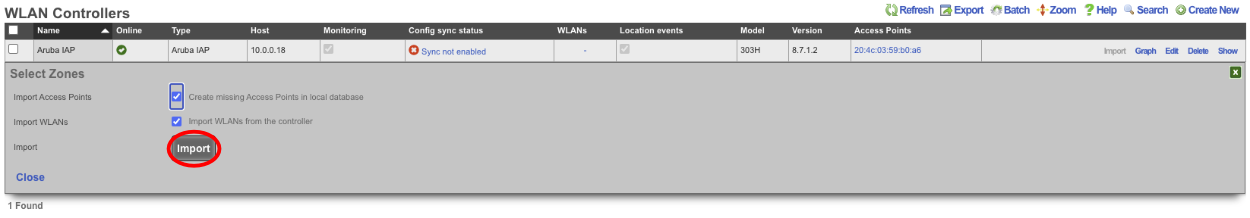- On the record that you created in the WLAN Controllers scaffold, click Import. You can then select which zones you would like to import. Leave blank for all zones. Press Import.