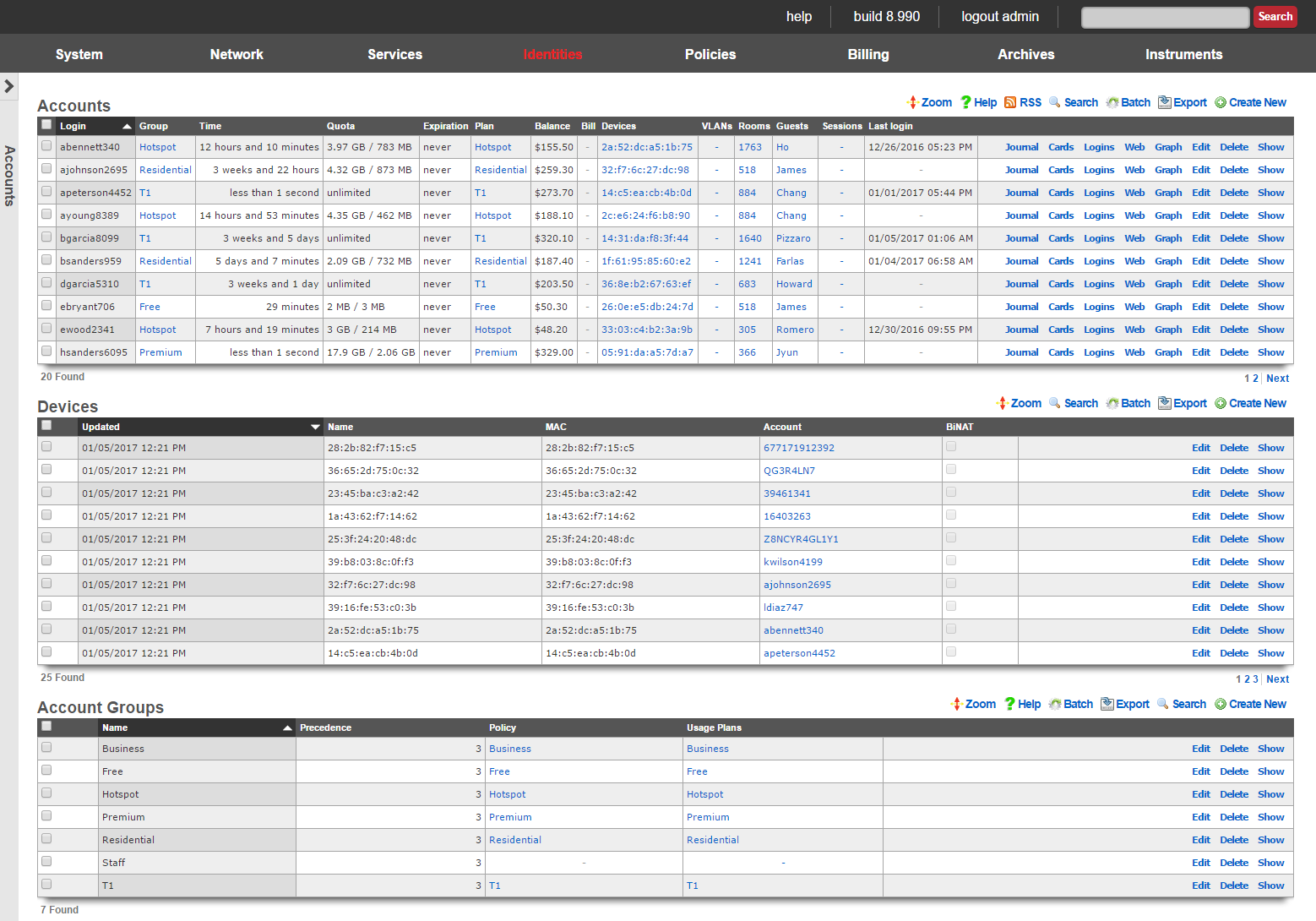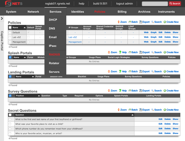 The rXg administrative console implements all five tenets of a trustworthy system. Three of the five tenets (authentication, authorization and non-repudiation) are controlled on this view.