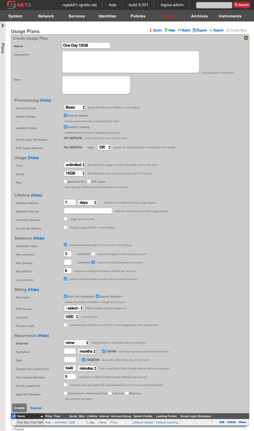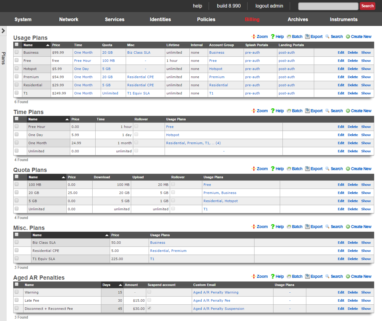 The billing permission authorizes control over configuration options and log retrieval for the rXg accounting mechanisms. Management of access and usage plans, download quotas, recurring billing, and other accounting related activities are governed by this permission.
