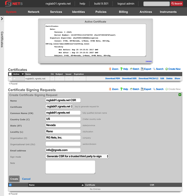 The operator must configure and maintain several aspects of the rXg in order to properly deploy and operate an rXg powered revenue generating network. The rXg requires the operator to create an administrator , install an SSL certificate signed by a trusted third-party, and configure the appropriate time zone and time server options before an RGN may be brought into production. These prerequisites, as well as many other global configuration settings, are configured via the views of the System menu.