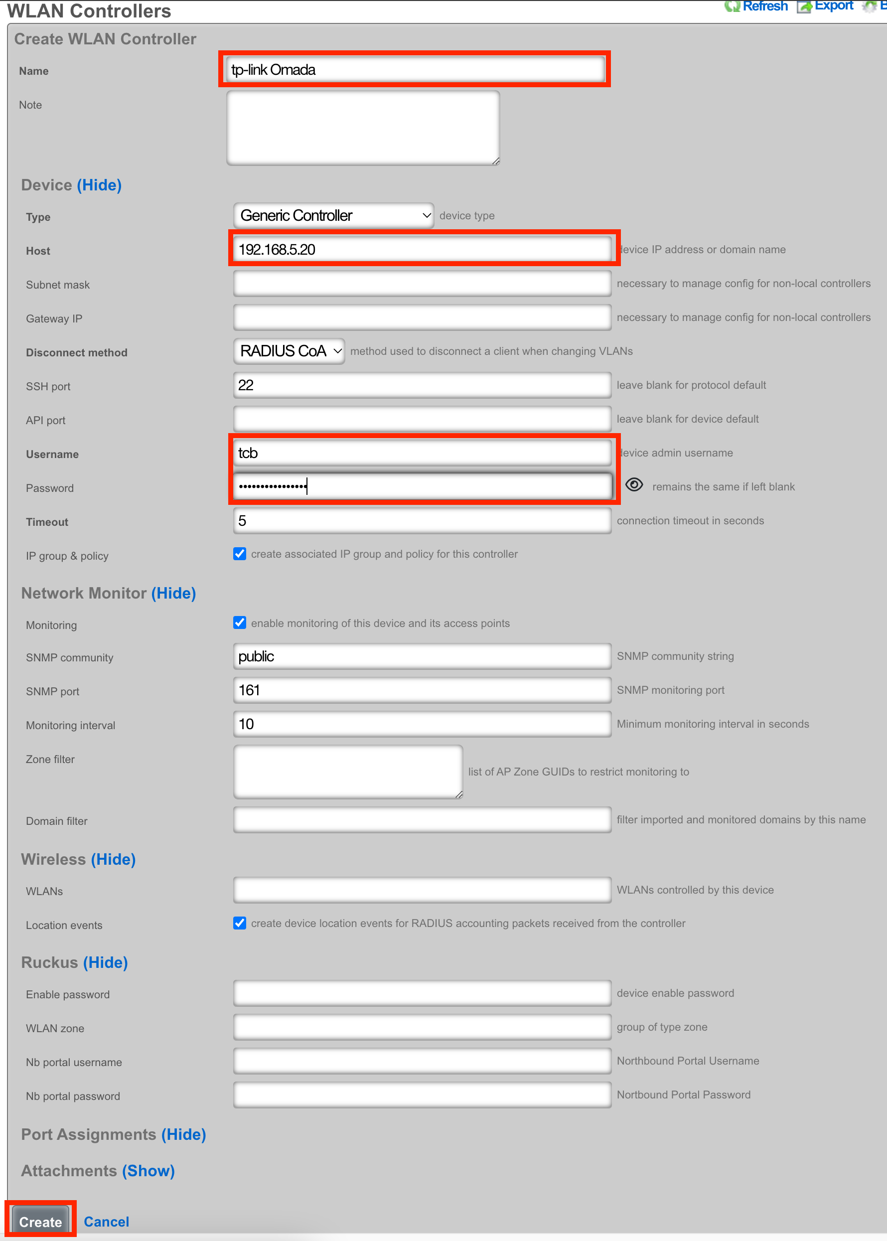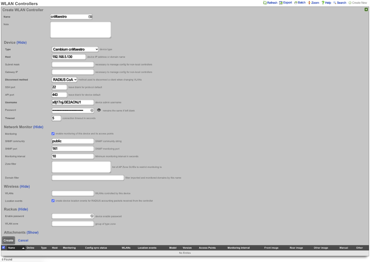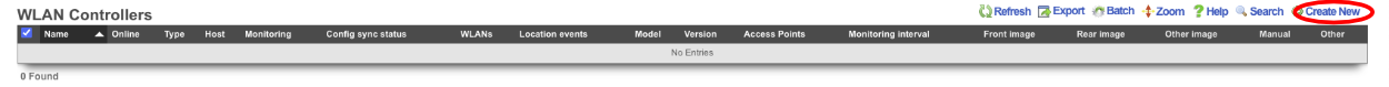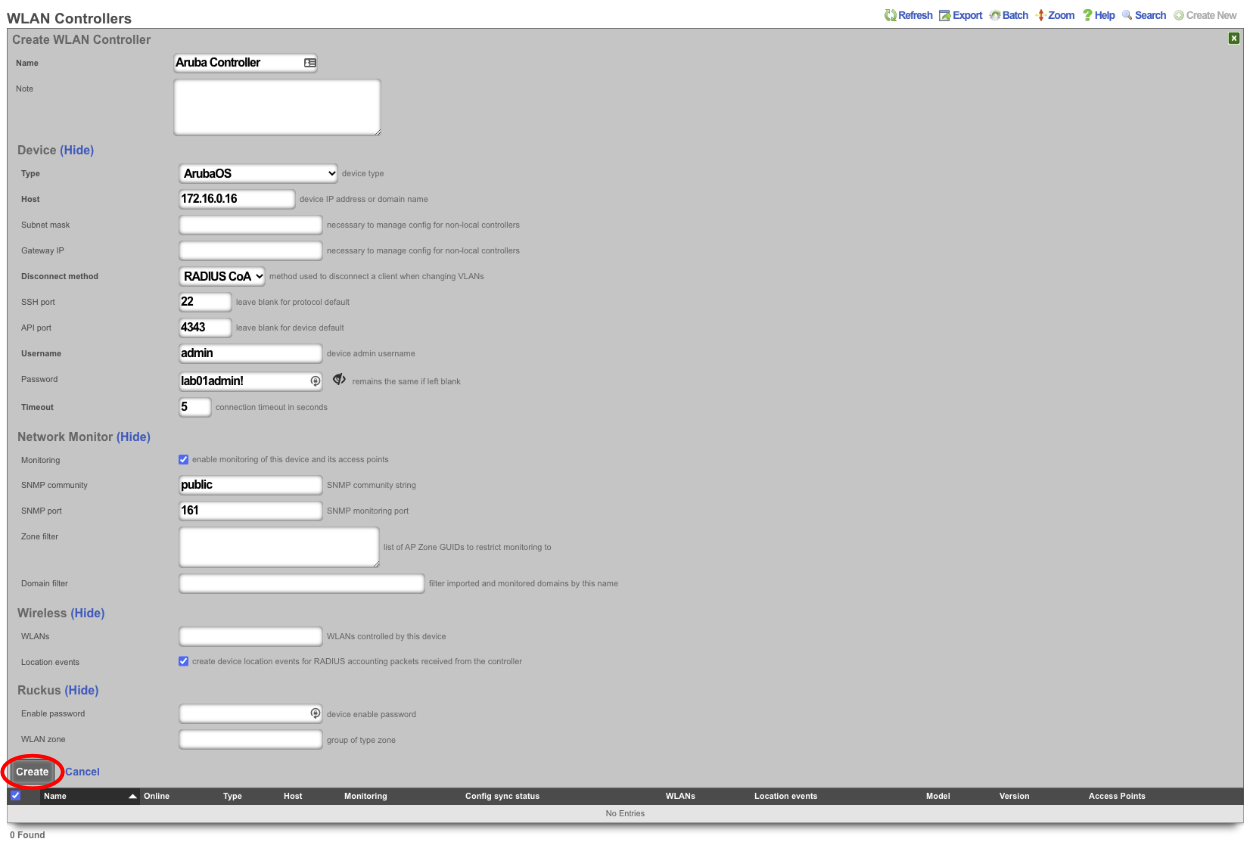In the rXg GUI, browse to Network >> Wireless >> WLAN Controllers and click Create New. Update the fields below to use the information you collected in step one and click create.