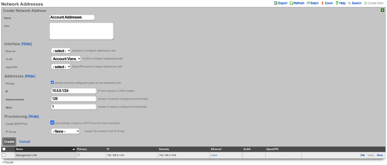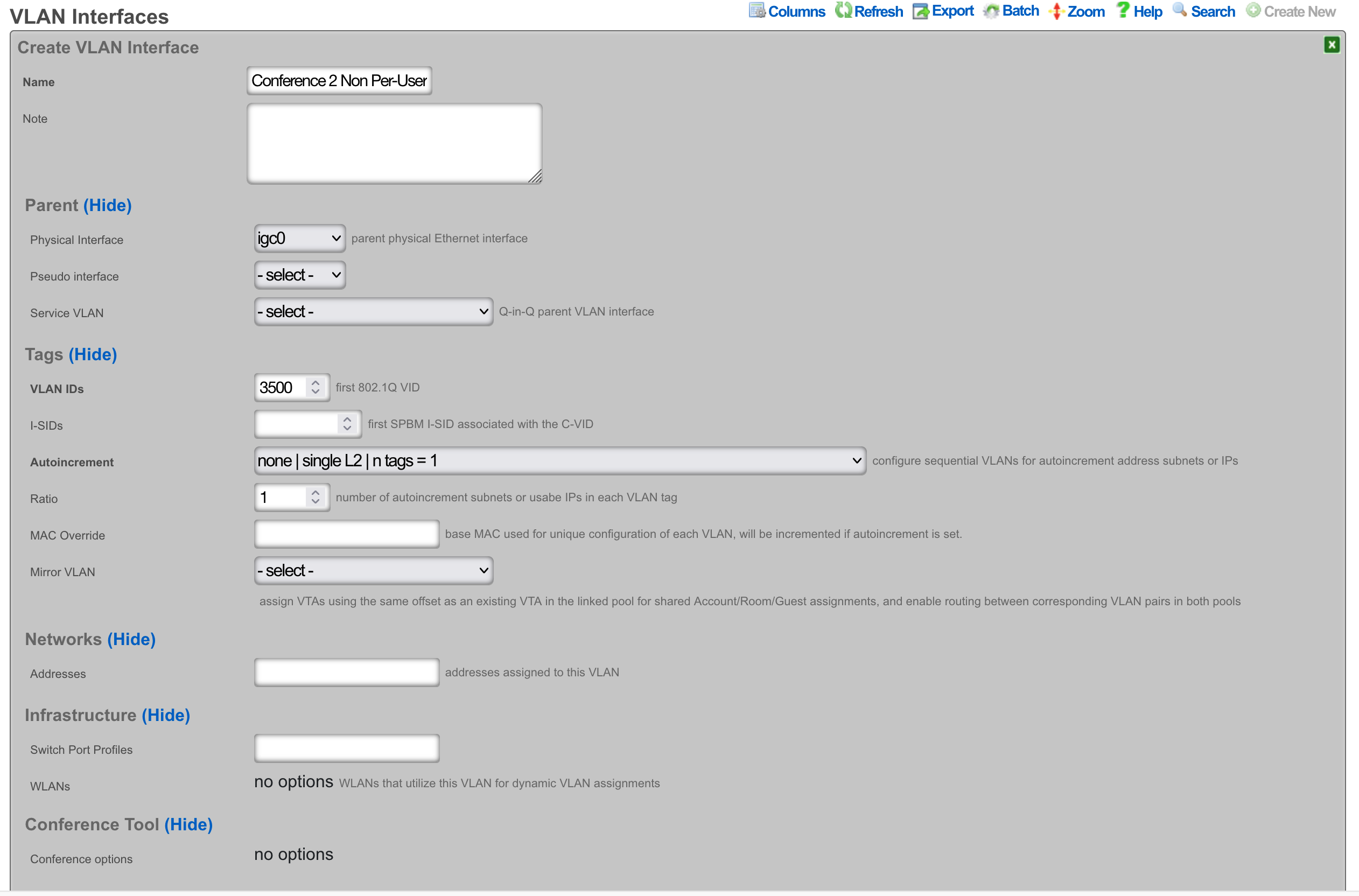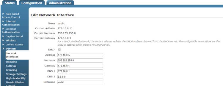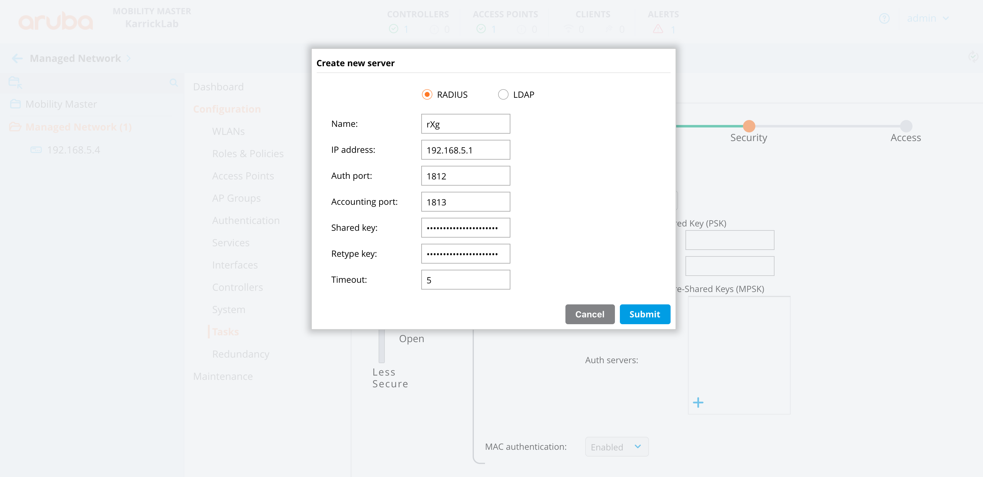 In the rXg GUI, browse to Network >> Wireless >> WLAN Controllers and click Create New. Update the fields below to use the information you collected in step one and click create.