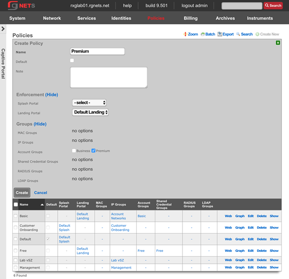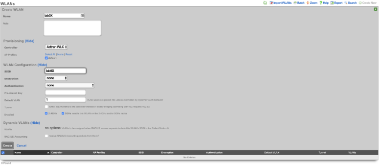 A WLAN must exist that matches the SSID of the WLAN in the Aruba controller, the rXg can import this information by creating a WLAN Controller. Configure a WLAN Controller by navigating to Network::Wireless and click create new on the WLAN Scaffold. This will allow the rXg to import the WLAN's from the Aruba controller.