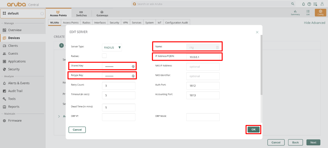 Connecting Aruba IAP to rXg