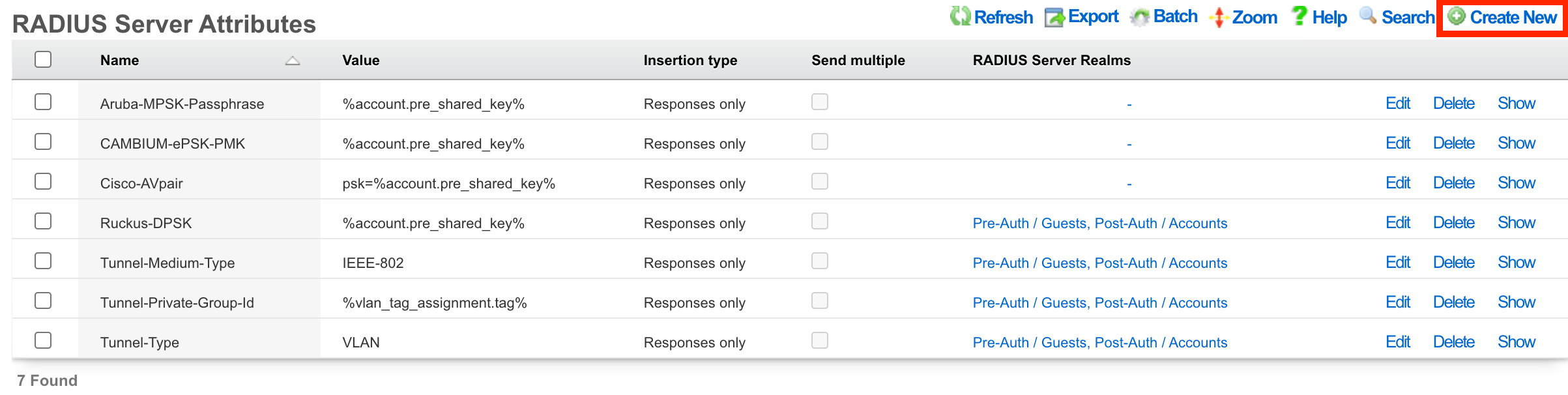In order to use MPSK the correct RADIUS Server Attributes must be tied the to the RADIUS Server Realms. By default there is a RADIUS server attribute for use with Aruba MPSK. This Attribute must be tied to each realm that will use MPSK typically this will be the POST auth realms, but for certain locations with pre-setup accounts this may be attached to both POST and PRE auth realms. For this example there will be a RADIUS server attribute created that will have a known PSK and this will be attached to the Onboarding realm. This allows anyone to connect with the known PSK and after account creation they will be able to use their unique MPSK to connect. In the RADIUS Server Attributes scaffold, click edit on the Aruba-MPSK-Passphrase entry.