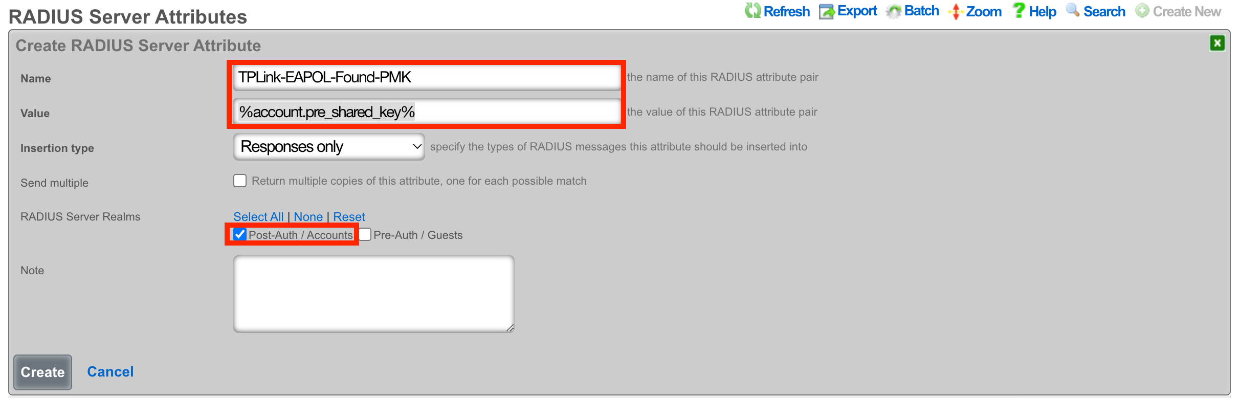 Next create a new RADIUS Server Attribute. In the Name field enter Aruba-MPSK-Passphrase. In the Value field enter in the known PSK, in this example lab01admin! will be used as the known PSK. In the RADIUS Server Realms field make sure that only the realms that are using the known PSK are selected in this case only the Onboarding Realm will be selected. Click Create.