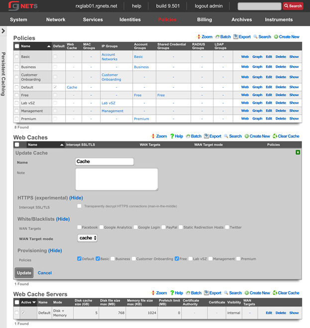 The policies permission authorizes control over configuration options that affect the end-user control and communication mechanisms. Configuration of the end-user experience via traffic shaping, HTML payload rewriting, content and packet filtering, etc. is governed by this permission.
