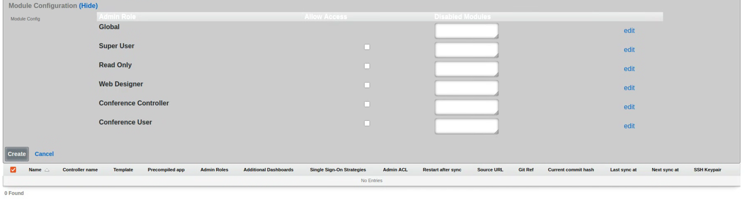 Each of the permission sets can be configured to be readwrite , readonly , or none. The readwrite setting allows full access. The readonly setting only allows administrators to view configuration for the section and disallows updates. The none setting does not allow any access to the section.