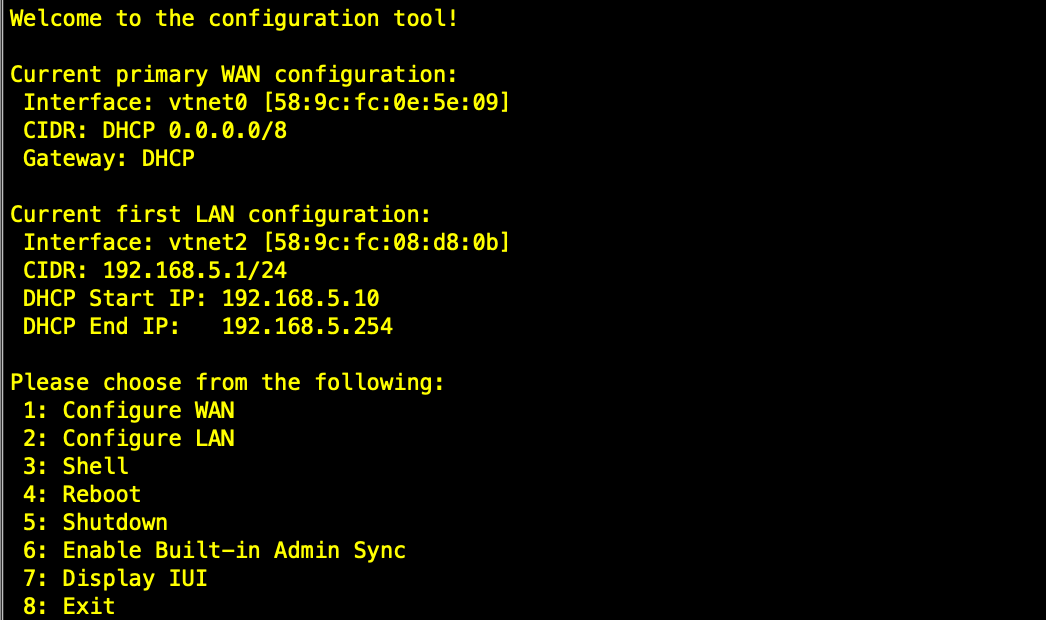 The reboot option will cause the rXg to power cycle. This is useful if the rXg is behaving erratically after an abnormal condition such as overflow of the persistent storage device.