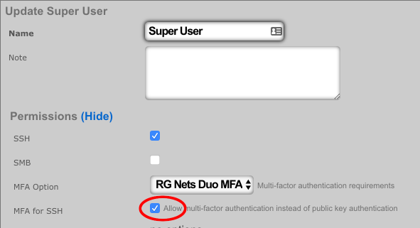 Multi-Factor Authentication may be enabled for SSH access by enabling the MFA for SSH checkbox when editing an individual admin role. When MFA is used with SSH, the administrator may continue using a public key, if configured, but will fall back to username and password authentication with a Multi-Factor Authentication prompt before completion.