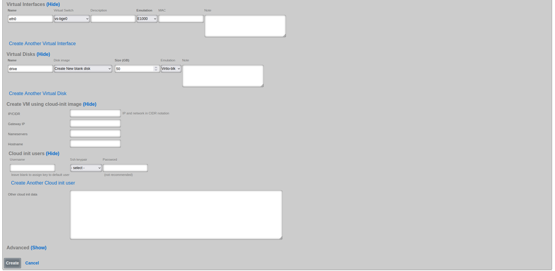 Primary Interface (eth0): - Name: eth0 (default primary interface name) - Virtual Switch: Select appropriate virtual switch (e.g., vs-bge0) - Emulation: E1000 (broad compatibility) or Virtio-net (better performance) - MAC Address: Auto-generated or specify custom if required