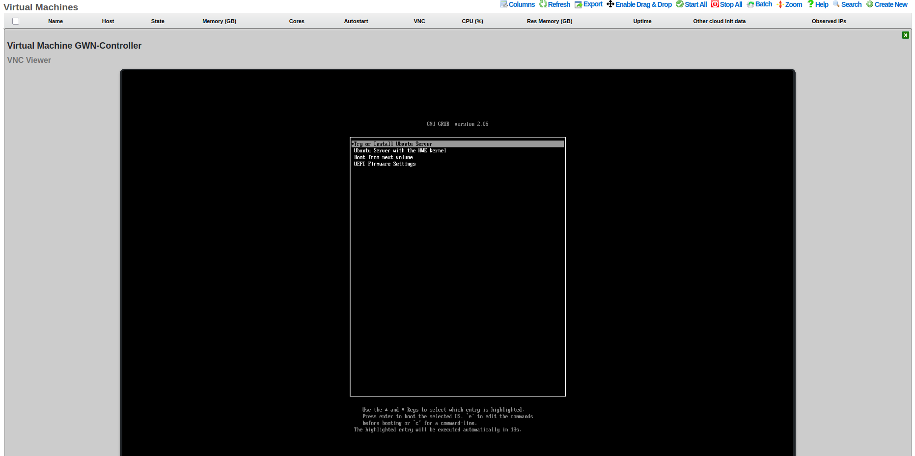 VNC Console Access: 1. Click on the VM name to access the detailed management page 2. VNC Viewer section provides browser-based console access 3. Boot process shows GRUB bootloader with Ubuntu installation options: - "Try or Install Ubuntu Server" (standard installation) - "Ubuntu Server with the HWE kernel" (Hardware Enablement kernel) - "Boot from next volume" (skip to next boot device) - "UEFI Firmware Settings" (access UEFI configuration)